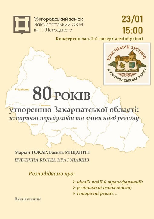 Запрошуємо в краєзнавчий музей на публічну бесіду з відомими краєзнавцями, істориками, науковцями-музейниками – Маріаном Токарем і Василем Міщанином, які повідають про історичну долю Закарпаття в моменти її внутрішньо- і зовнішньополітичних потрясінь, про характерні особливості змін назв регіону і, врешті, про повоєнне, в середині ХХ століття, приєднання краю до Радянської України (УРСР/СРСР), а також про перші діяння радянської влади в новоутвореній 80 років тому Закарпатській області…