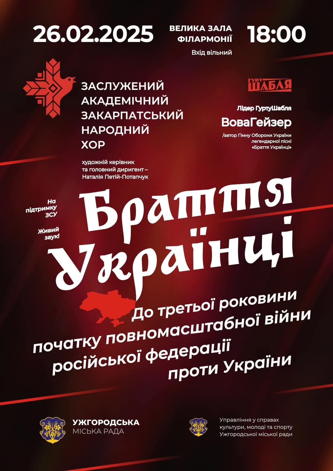 Заслужений академічний Закарпатський народний хор спільно з Управління у справах культури, молоді та спорту Ужгородської міської ради організовують музичний вечір на підтримку Збройних Сил України.