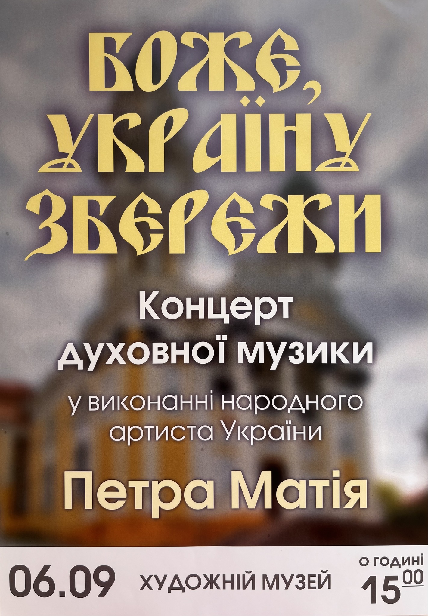 Закарпатський обласний художній музей ім. Й.Бокшая запрошує на концерт народного артиста України Петра Матія “Боже, Україну збережи”.