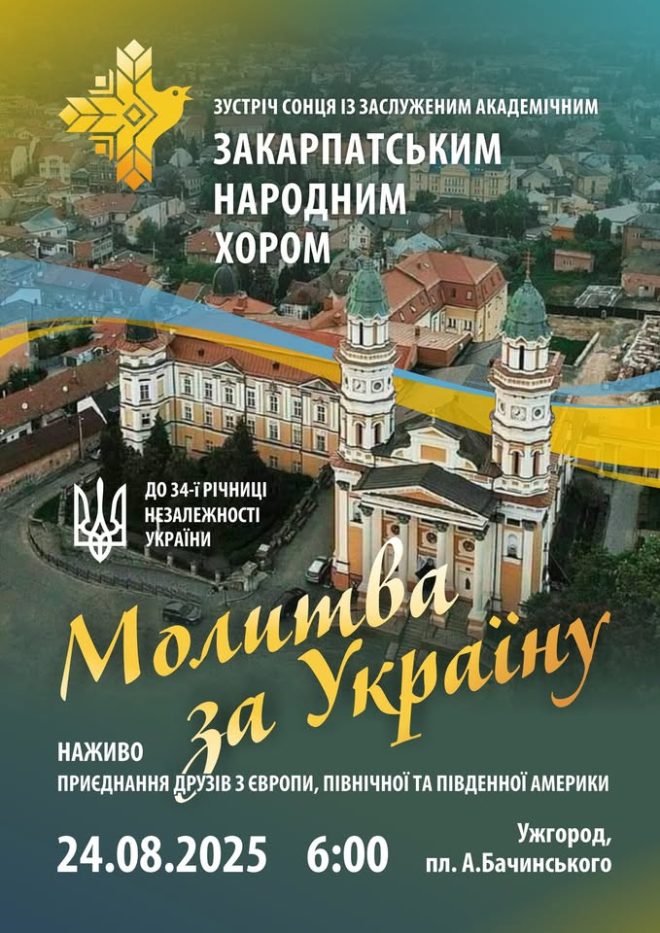 Закарпатський народний хор запрошує 24 серпня на традиційну мистецько-патріотичну акцію “Молитва за Україну”, яка цього року пройде біля Кафедрального собору — на площі єп. А.Бачинського о 06:00. До ужгородців і гостей міста цього разу приєднаються наживо друзі з Європи, Північної та Південної Америки.