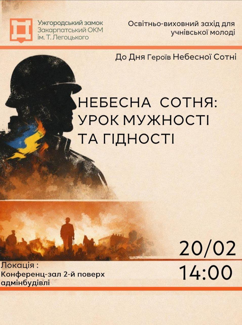 20 лютого 2026 року о 14:00 год. у Закарпатському обласному краєзнавчому музеї ім. Т. Легоцького відбудеться освітньо-виховний захід для учнівської молоді «Небесна Сотня: урок мужності та гідності».