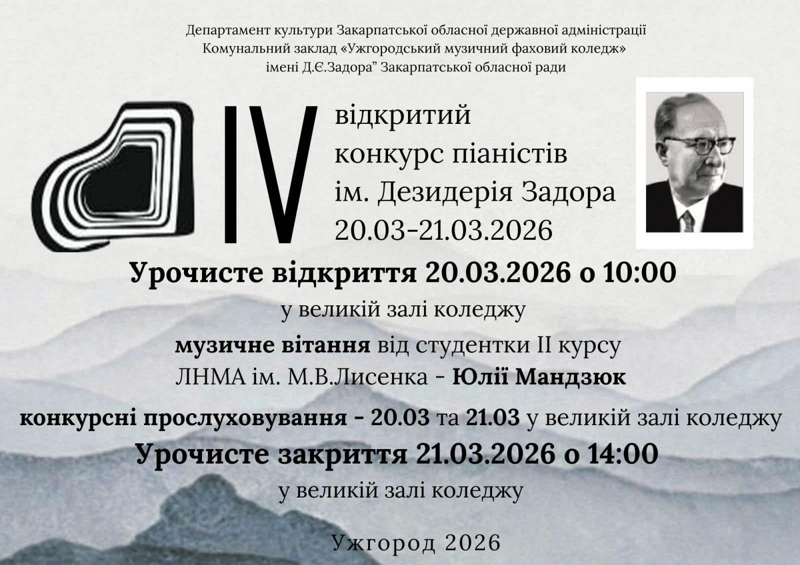 20-21 березня в Ужгороді відбудеться ІV Відкритий конкурс піаністів імені Д.Є.Задора.