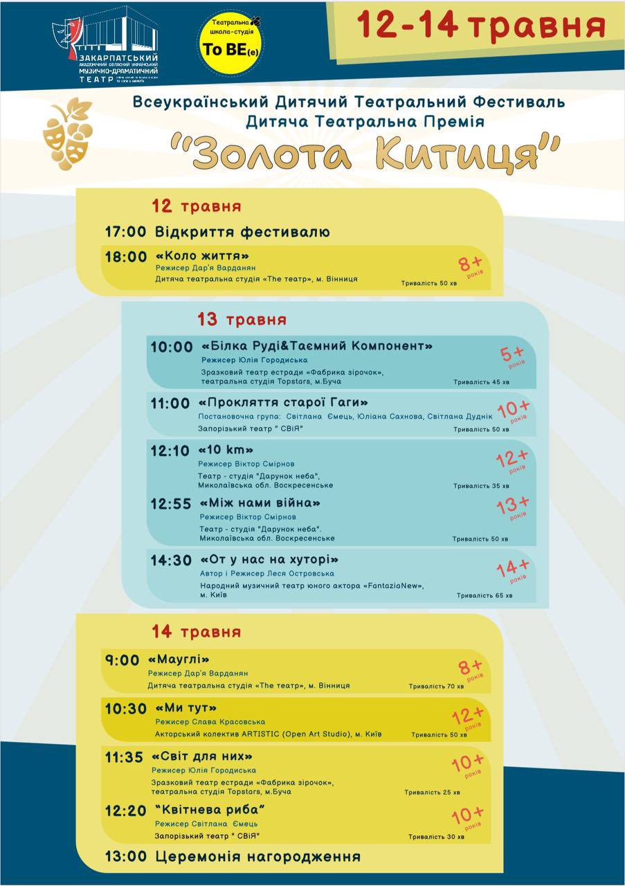 Свої вистави презентують 6 дитячих акторських колективів зі столиці, Запоріжжя, Вінниці, Київської та Миколаївської областей. На великій сцені облмуздрамтеатру в Ужгороді виступатиме понад 120 юних театралів.