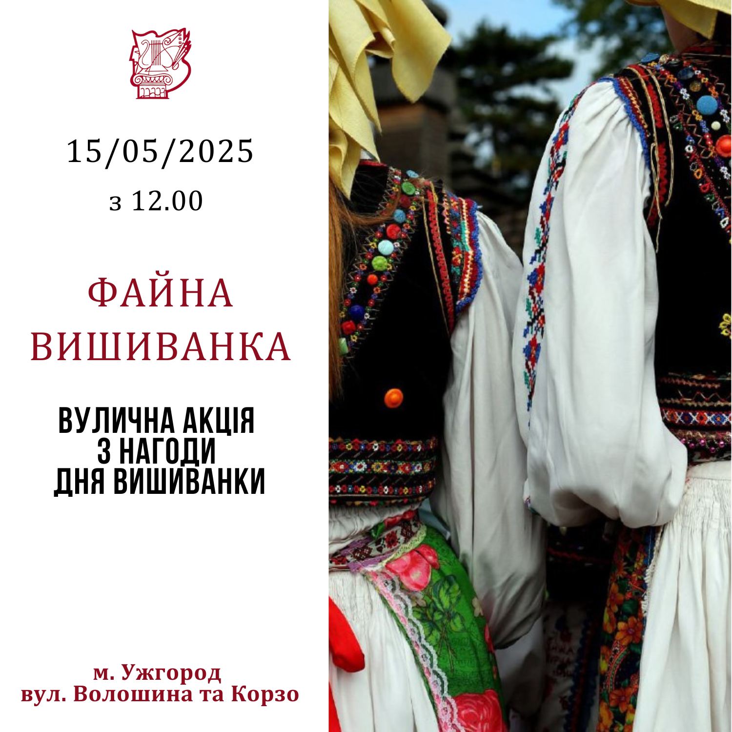 Вулична акція “Файна вишиванка” З нагоди Дня вишиванки 15 травня 2025 р. працівники Центру культури проведуть акцію «Файна вишиванка». Початок о 12.00. Дата 15 Тра 2025 Термін дії минув! час 12:00