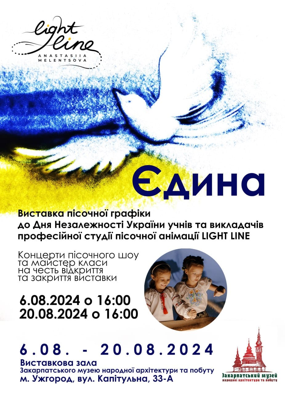 До уваги відвідувачів – виставка пісочної графіки до Дня Незалежності України учнів та викладачів професійної студії пісочної анімації LIGHT LINE. На виставці “Єдина” ви зможете насолодитися не лише віддруками цього мистецтва, але й долучитися до концерту пісочного шоу та майстер-класів.