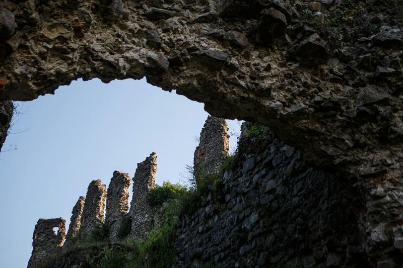 When you go up to the castle, you can see that only ruins remain of the once mighty fortress. The majestic walls are only fragmentary, with a few pieces of walls with loopholes and the foundation of the chapel visible.