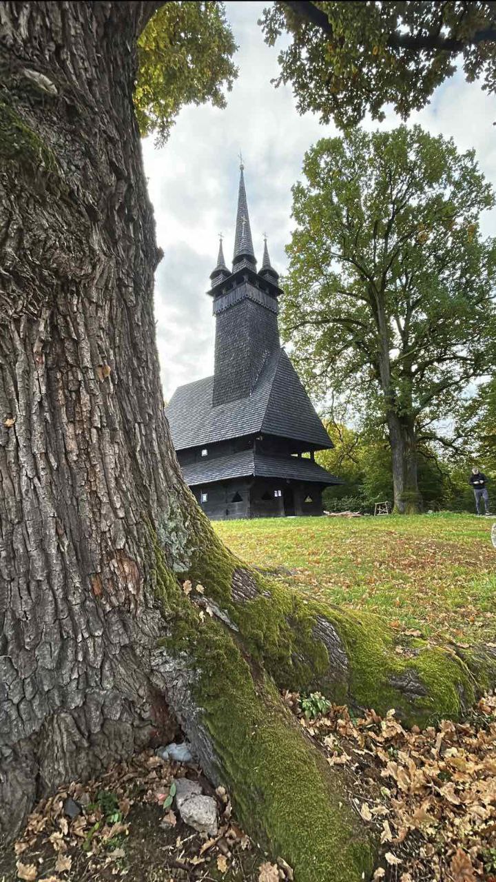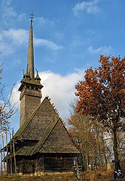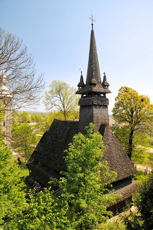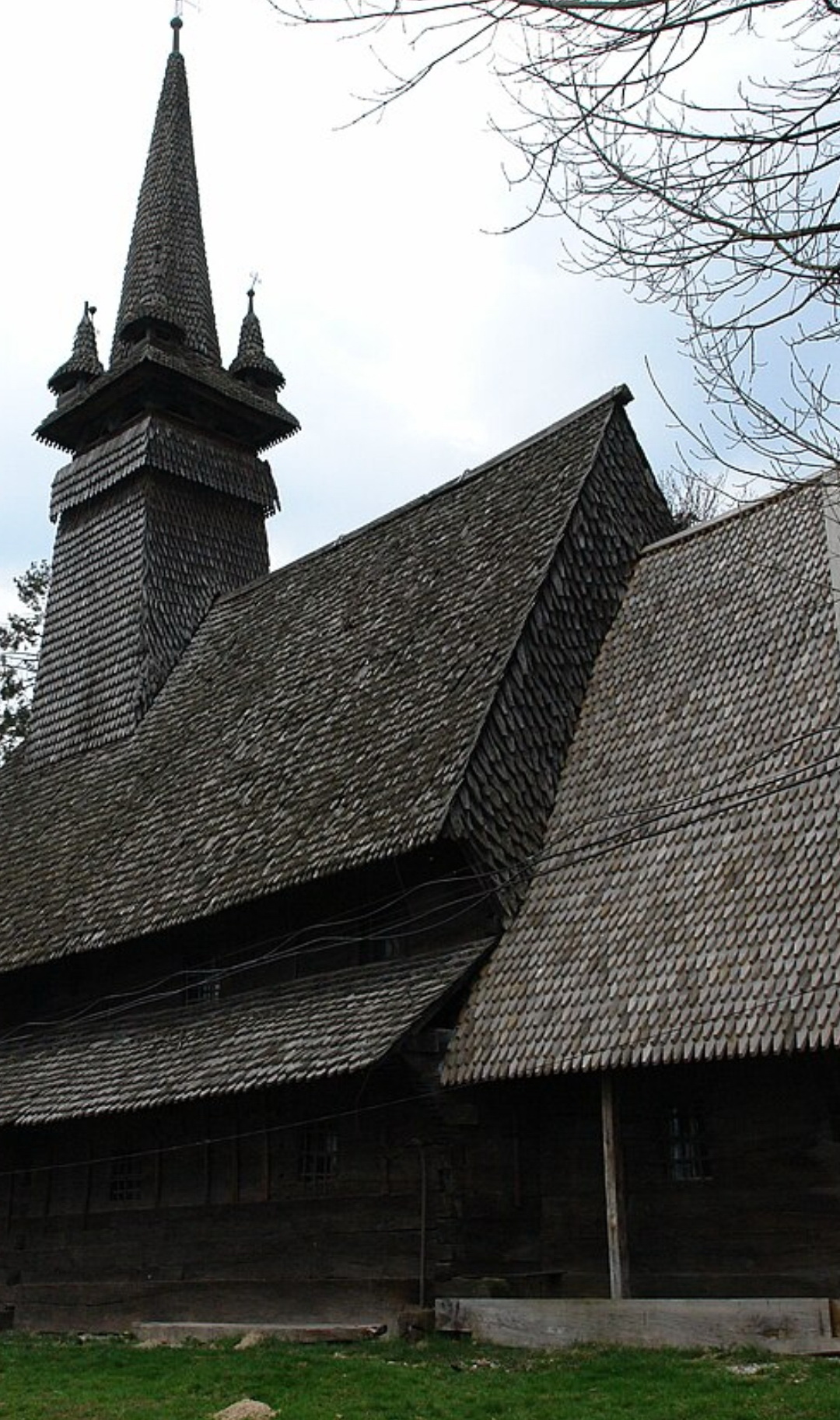Готична церква зі шпилем, заввишки 25 метрів, виглядає дуже монументально. Бічні фасади – це широкі дубові плахи зрубу з високими схилами вкритих шинелями дахів. Головний зруб об’єднує наву, бабинець і закриту галерею з трикутними прорізами на головному західному фасаді.