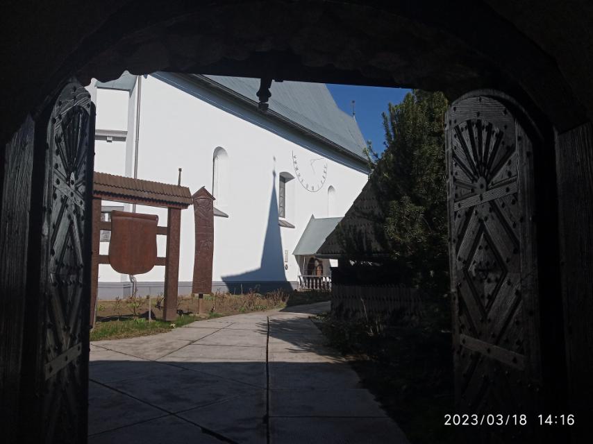 Заходячи в храм, бачимо чудові архітектурно-художні деталі. А саме – могутні одвірки галереї, прикрашені мотузочком – орнаментом, вище якого вирізьблено дату спорудження.  Довкола вхідних дверей – орнаменти зі стародавніми символами сонця.