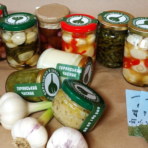 Pickled garlic with lavender or pepper, pickled garlic arrows, garlic sauce and other delicacies made from organic garlic grown in Transcarpathia