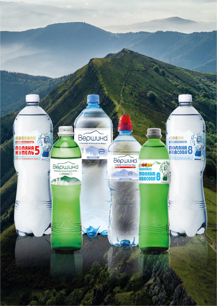 Столова мінеральна вода “Вершина” газована 1,5 л, 0,5 л ПЕТ; 0,5 л скло/ негазована 1,5 л, 0,8 л, 0,8 л (спортивний ковпачок), 0,5 л ПЕТ; 0,5 л скло.