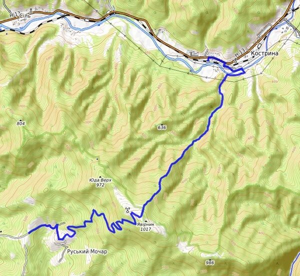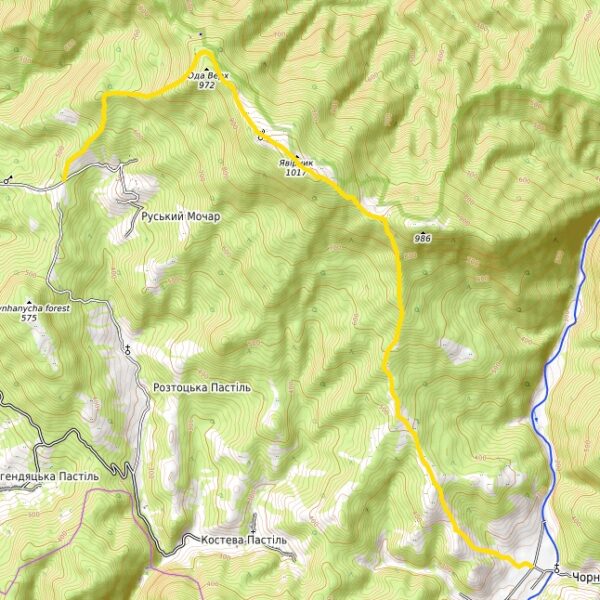 The length of the route is 12.5 km, with an altitude difference of 760 m. The average journey time is 4-7 hours. This is a one-day route that connects the villages of Ruskyi Mochar and Chornoholova in Uzhhorod district, crossing the Yavirnyk ridge. The marking was updated in 2016 and is yellow.