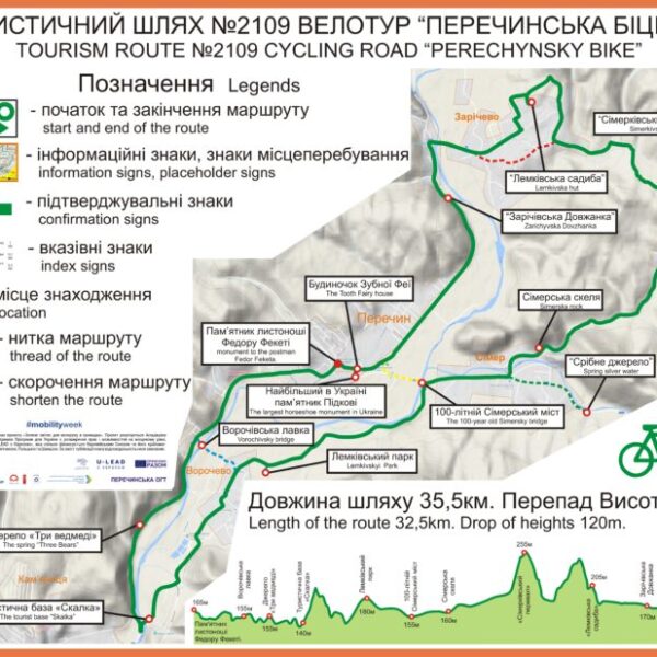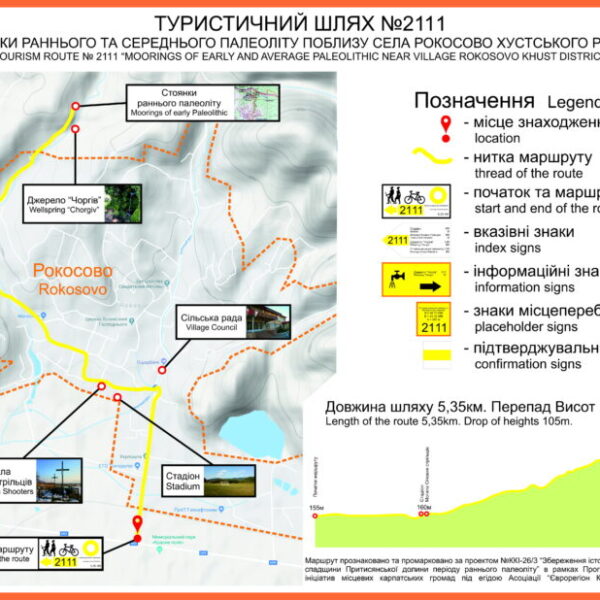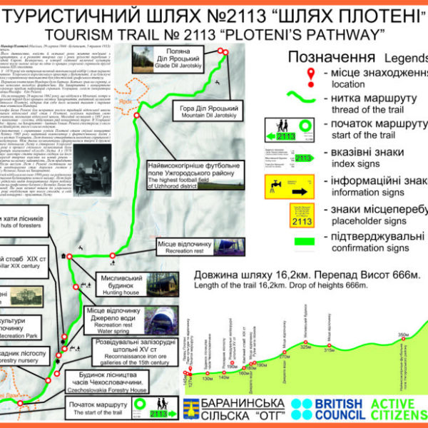 The route connects two settlements: Velyki Lazy village and Yarok village of the Baranynska AH, namely the Ploteni Palace and Dil Yarotskyi mountain.