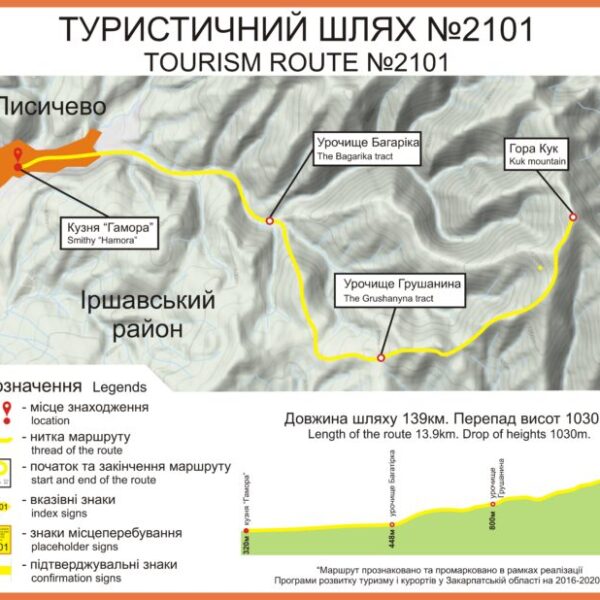 The route starts in the village of Lysychovo, Khust district, from the Hamora Museum and Forge. It connects the historical and technical monument of culture and Transcarpathian Tourist Route. It will help travellers to climb to one of the peaks of the Polonynsky ridge while exploring the cultural heritage and active tourists travelling along the Transcarpathian Tourist Route to visit a unique cultural monument.