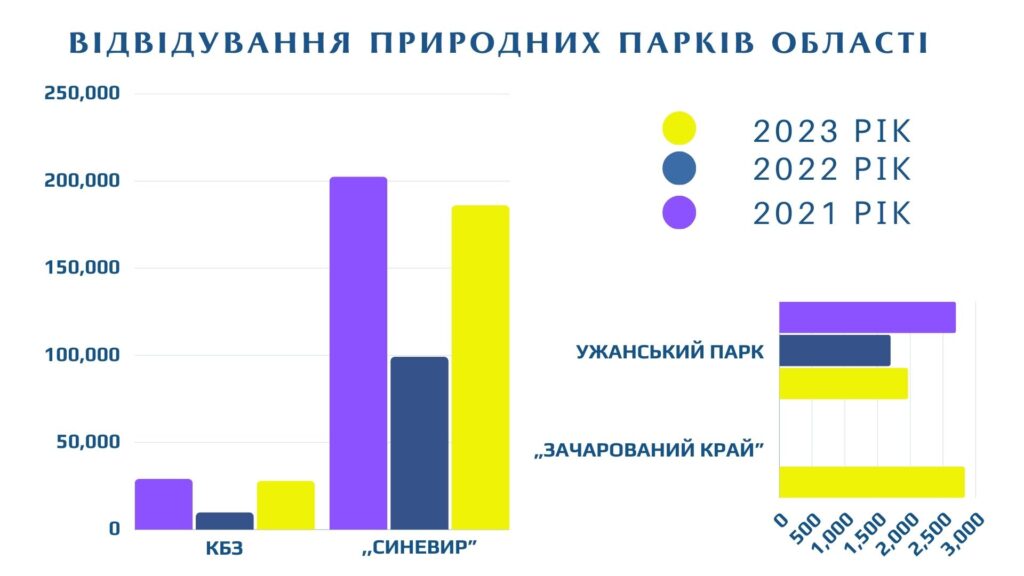 In 2023, the national parks of Transcarpathia received 218,920 guests. In particular, more than 186.1 thousand tourists visited Synevyr National Nature Park, about 28 thousand tourists visited the Carpathian Biosphere Reserve, 2,835 thousand tourists visited Enchanted Land National Nature Park, and 1,967 thousand tourists visited Uzhansky National Nature Park.