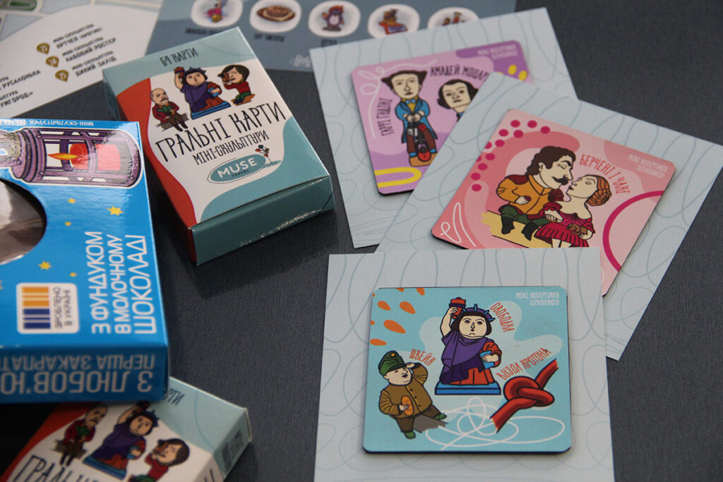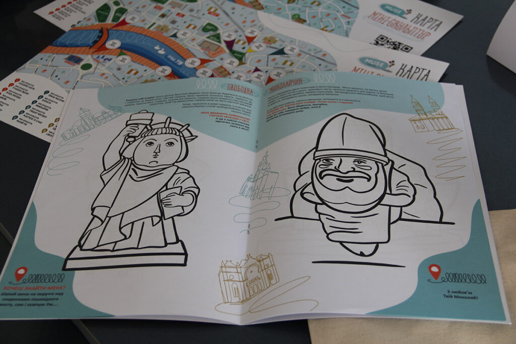 To improve the tourist attractiveness of Uzhhorod, a souvenir collection dedicated to the mini-sculptures' characters was also developed, including shopping bags, playing cards, magnets, postcards, mugs, and children's colouring books. We also made a "tour box" for tourists - a box containing tickets to the city's museums and a map.