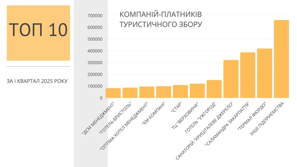 Фізичні особи-підприємці сплатили до бюджетів Закарпаття 2,9 млн грн. ФОПи, які увійшли у ТОП 10 найбільших платників туристичного збору у І кварталі 2025 року (загалом 872 тис. грн, або 16%) здійснили сплату до бюджетів громад:
