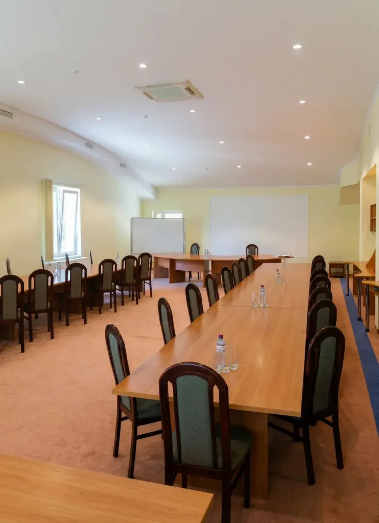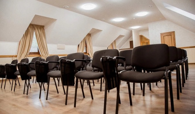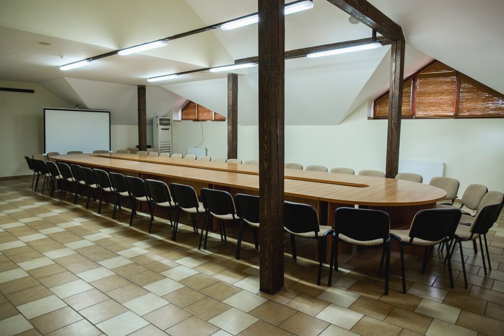 Просторий конференц-зал на 120 місць оснащений необхідними меблями та презентаційним обладнанням.