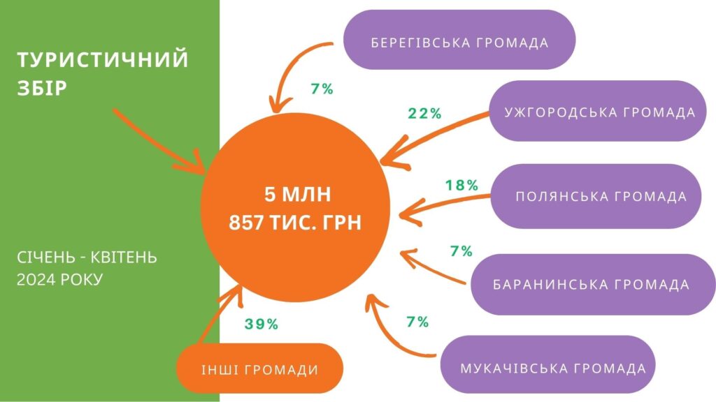 Найбільші суми туристичного збору надійшли до бюджетів територіальних громад:  м. Ужгород – 1 322,7 тис. грн; с. Поляна –  1 035,8 тис. грн; м. Берегове – 415,0 тис. грн; м. Мукачево –  404,9 тис. грн; с. Баранинці –  395,0 тис. грн; с. Косонь –  348,0 тис. грн; м. Виноградів – 271,2 тис. грн; с. Оноківці – 202,1 тис. грн; смт. Ясіня – 171,2 тис. грн; с. Вишка – 162,2 тис. грн; смт. Середнє – 157,2 тис. грн.