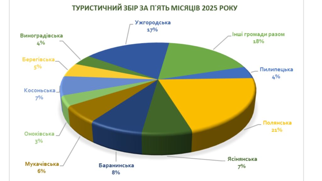 Найбільші суми туристичного збору надійшли до бюджетів територіальних громад: с. Поляна – 2 191,0 тис. грн; м. Ужгород – 1 813,2 тис. грн; с. Баранинці – 812,3 тис. грн; смт. Ясіня – 732,5 тис. грн; с. Косонь – 718,0 тис. грн; м. Мукачево – 620,1 тис. грн; м. Берегове – 520,8 тис. грн; с. Пилипець – 460,5 тис. грн; м. Виноградів – 405,8 тис. грн; с. Оноківці – 376,4 тис. грн.
