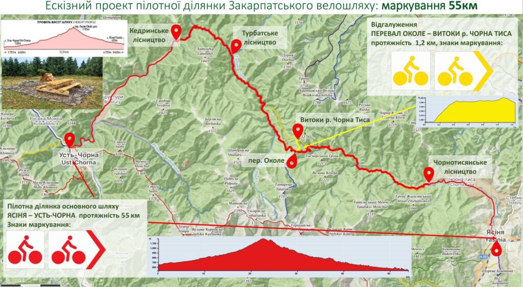 Пілотна ділянка «Усть-Чорна – Ясіня», протяжністю 55 км, починається поблизу витоків Чорної Тиси та перевалу Околе. Вздовж маршруту розміщені об’єкти для відпочинку та рекреації, а також туристичні садиби, велопарковки, місця для кемпінгів, оглядові майданчики та локальні гастрономічні атракції.
